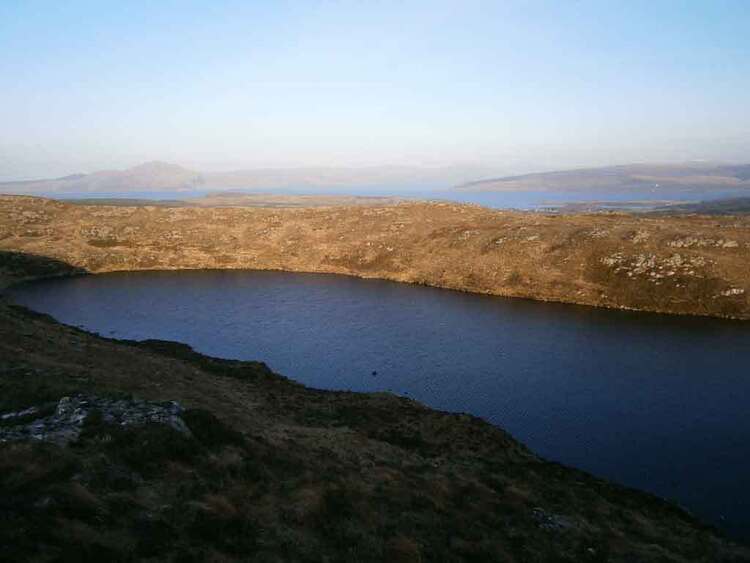 Go over a stile and follow the track up behind the cottage and head for the gate. Go through the gate and keep on the track where you are constantly in view of the summit of the volcanic hill, S’Airde Beinn with it’s hidden crater loch.